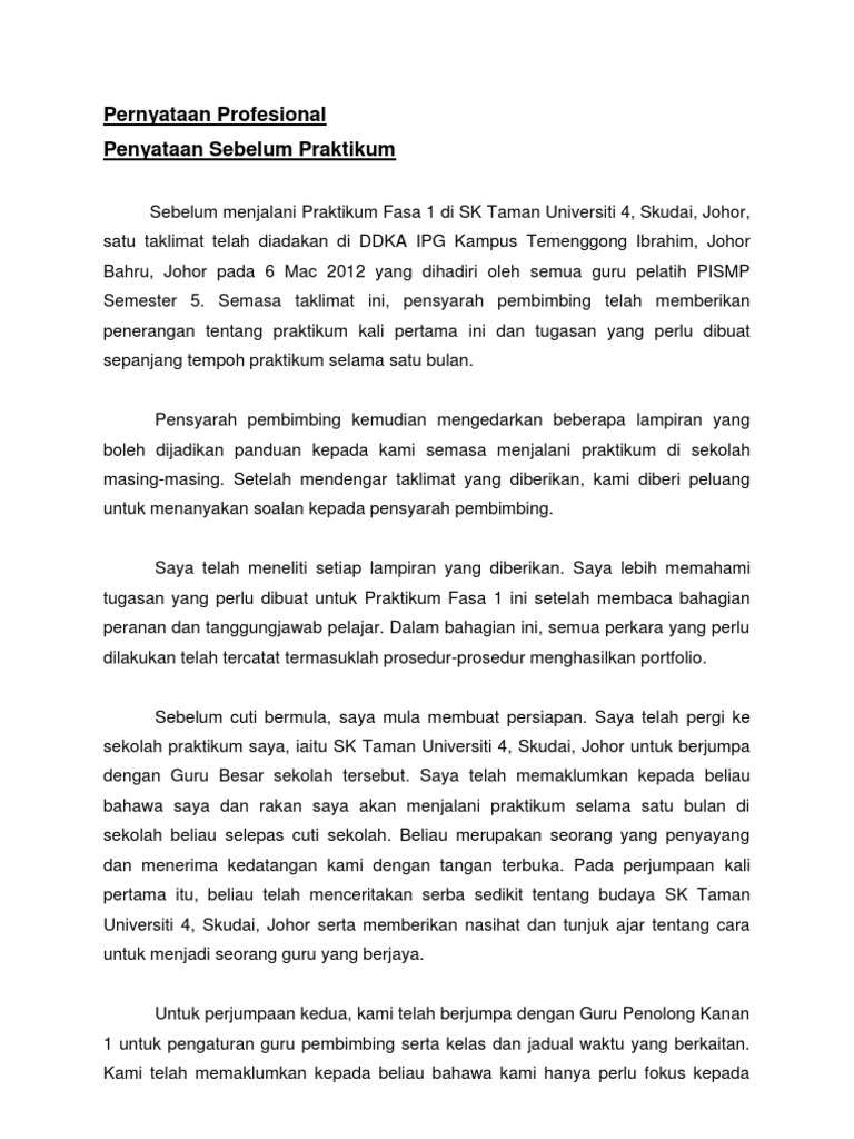 . View pernyataan profesional semasadocx from ILMU PENDI EDUP 3063 at IPGK TUN HUSSEIN. Pernyataan profesional semasa praktikum praktikum merupakan salah satu cara bagi seorang guru pelatih melatih diri untuk mengajar dan. Scribd adalah situs bacaan dan penerbitan sosial terbesar di dunia.